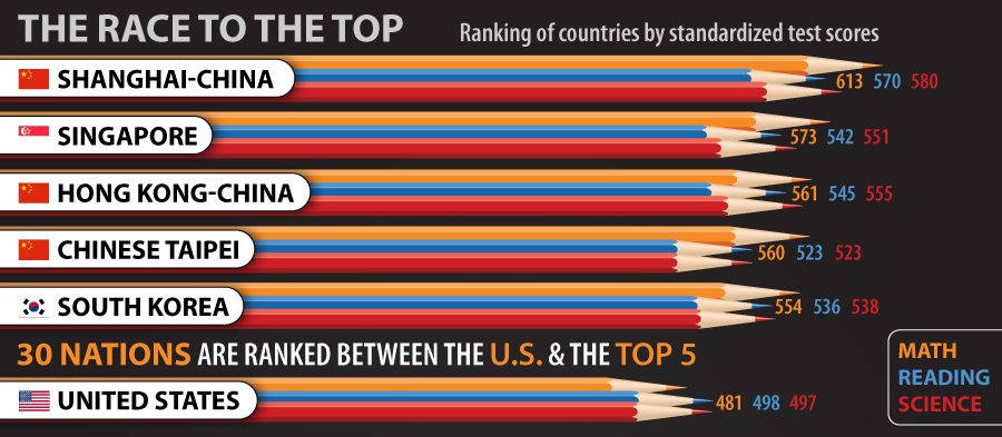 From the Department of Defense, to manufacturing giants, to Silicon Valley, everyone’s bemoaning the fact that American students are falling behind the students of other nations. Decreasing international rankings, changing skills needed for the workplace, and a shortage of technically skilled workers are all pressing issues for education, and sweeping legislation has tried to remedy the situation. In 2002 the “No Child Left Behind” act was signed into law, pushing for the impossible goals of 100% math and reading proficiency in America’s classrooms. A secondary goal of having 100% highly qualified teachers by 2006 is somewhat more achievable, but coupled with later legislation and increased reliance on high stakes testing, has made the jobs of teachers more stressful than ever. Several states have opted out of “No Child Left Behind.” But when the even more sweeping Common Core Curriculum was passed in 2010, the race was back on, with many academic standards raised by nearly a grade level.